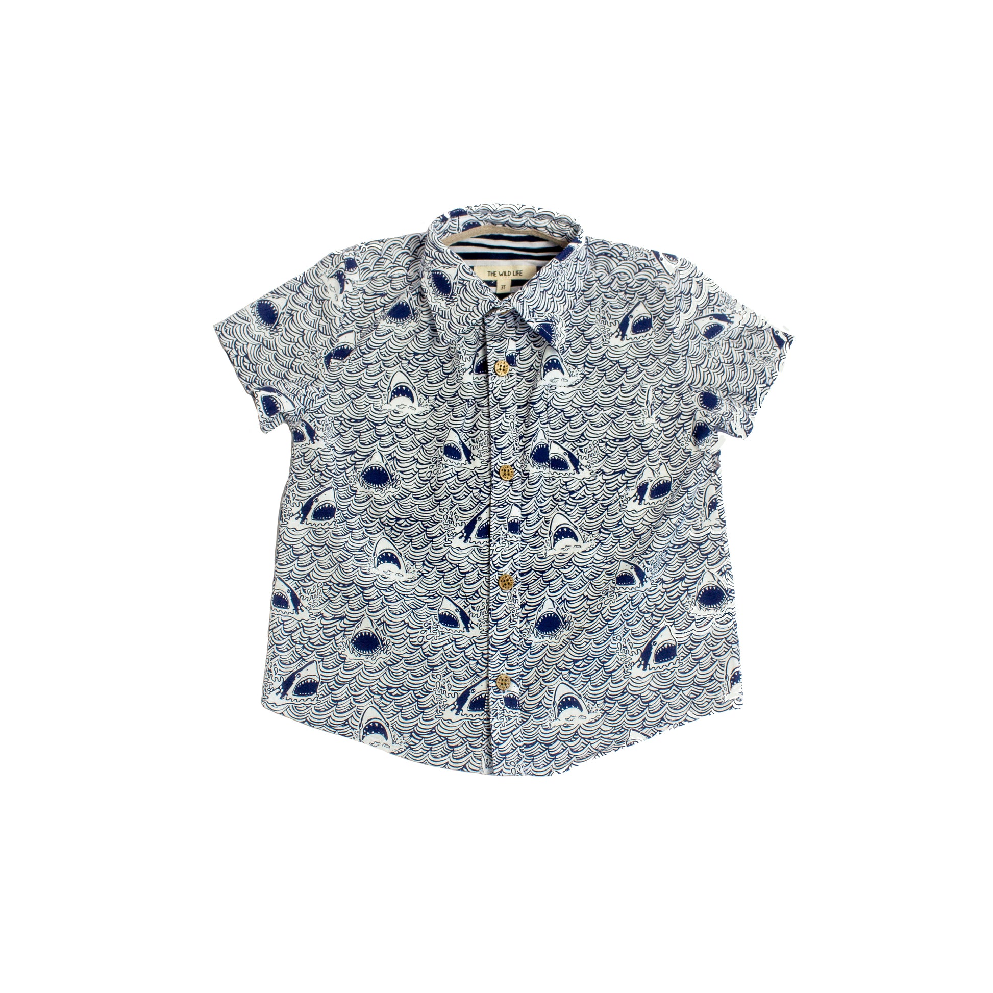 This button down collared shirt is perfect for any adventure! This shirt features one chest pocket and five engraved buttons and an all-over shark print.