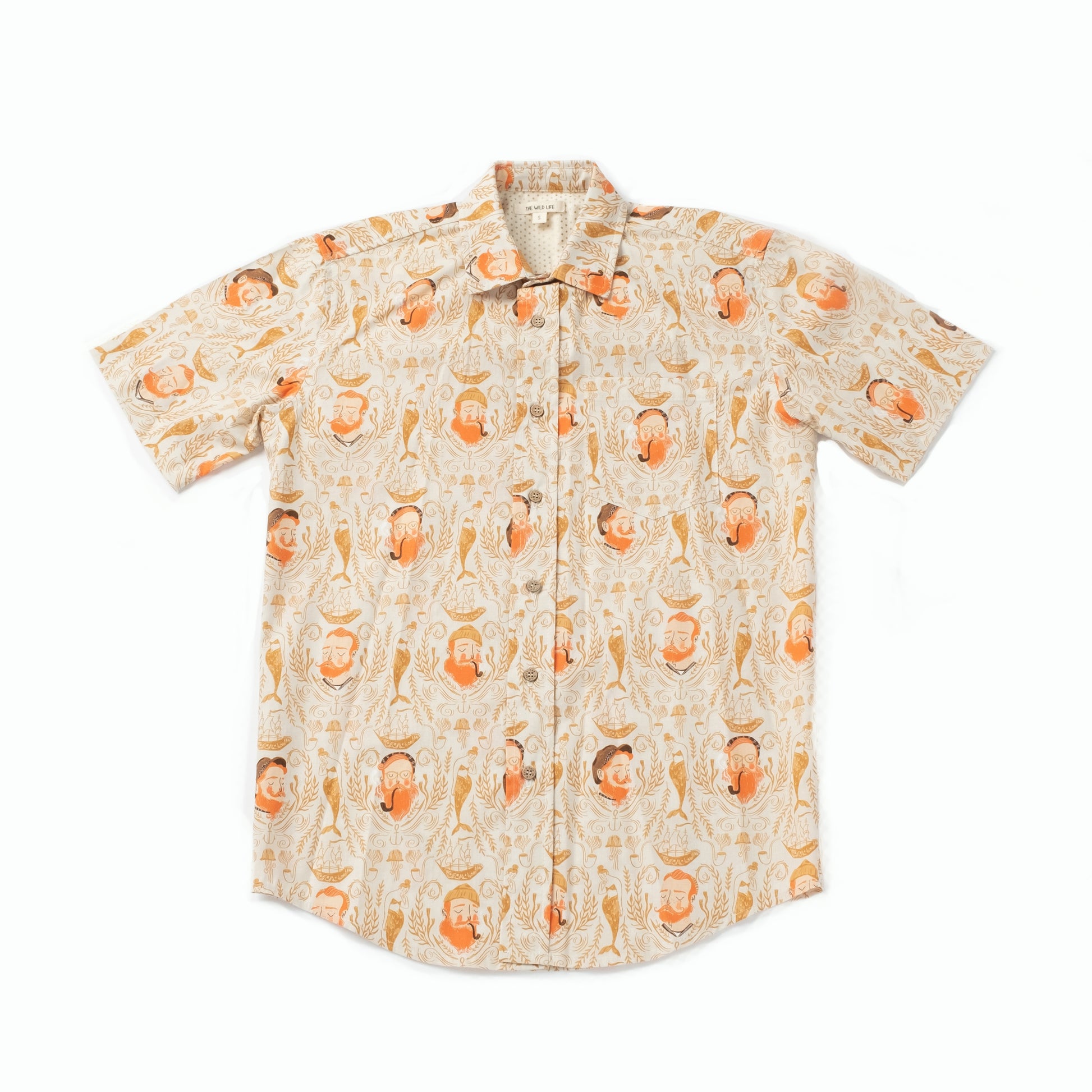 This expertly tailored shirt is not for the faint of heart. The Salty Sailor shirt features an all over bearded sailor toile print with mermaids and sea creatures mixed in, a contrasting gold dot interior yoke, five engraved coconut buttons, and one chest pocket.