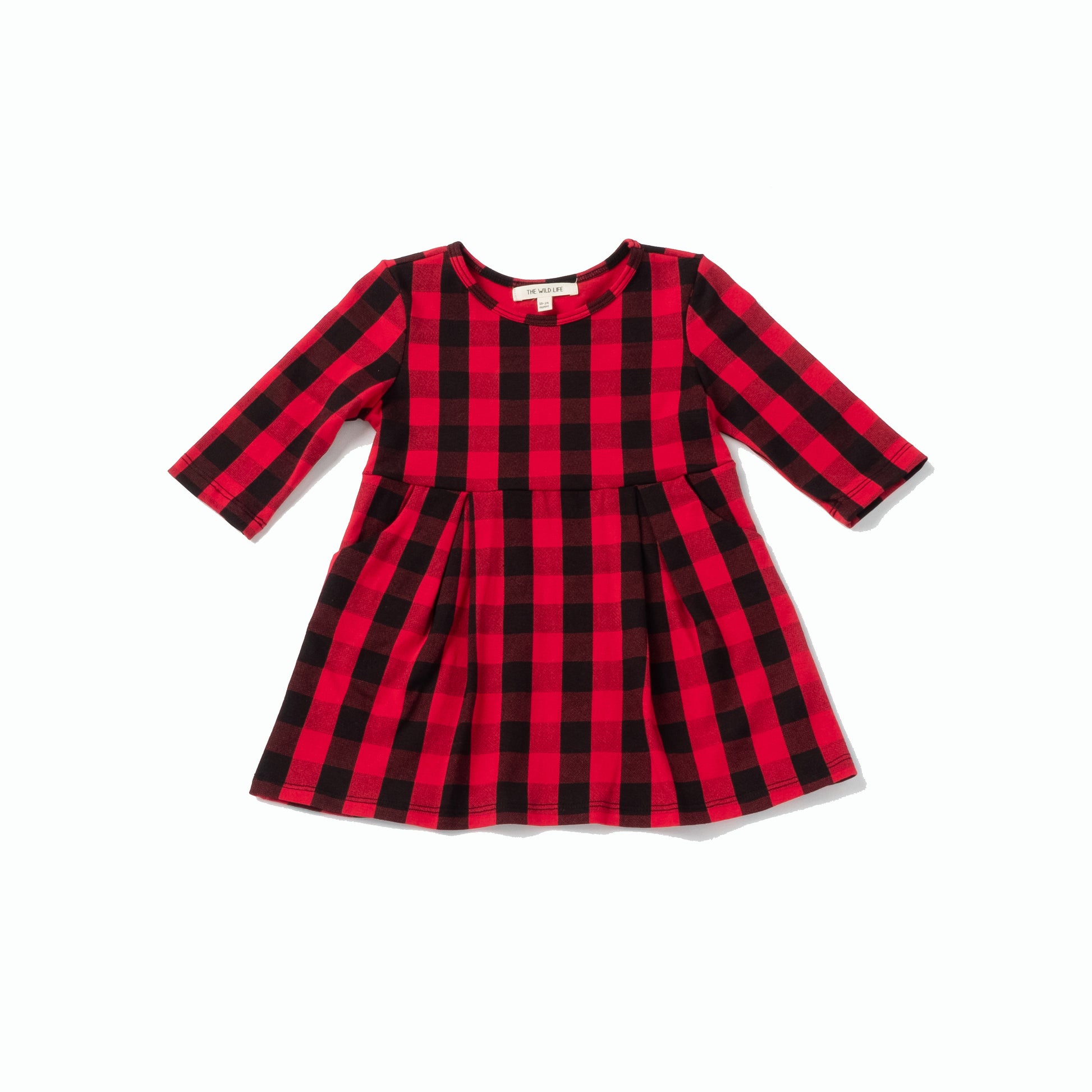 Sweet and classic pocket dress in holiday classic buffalo plaid. Knit fabric, ¾ sleeves, rounded neckline, pull-on style.