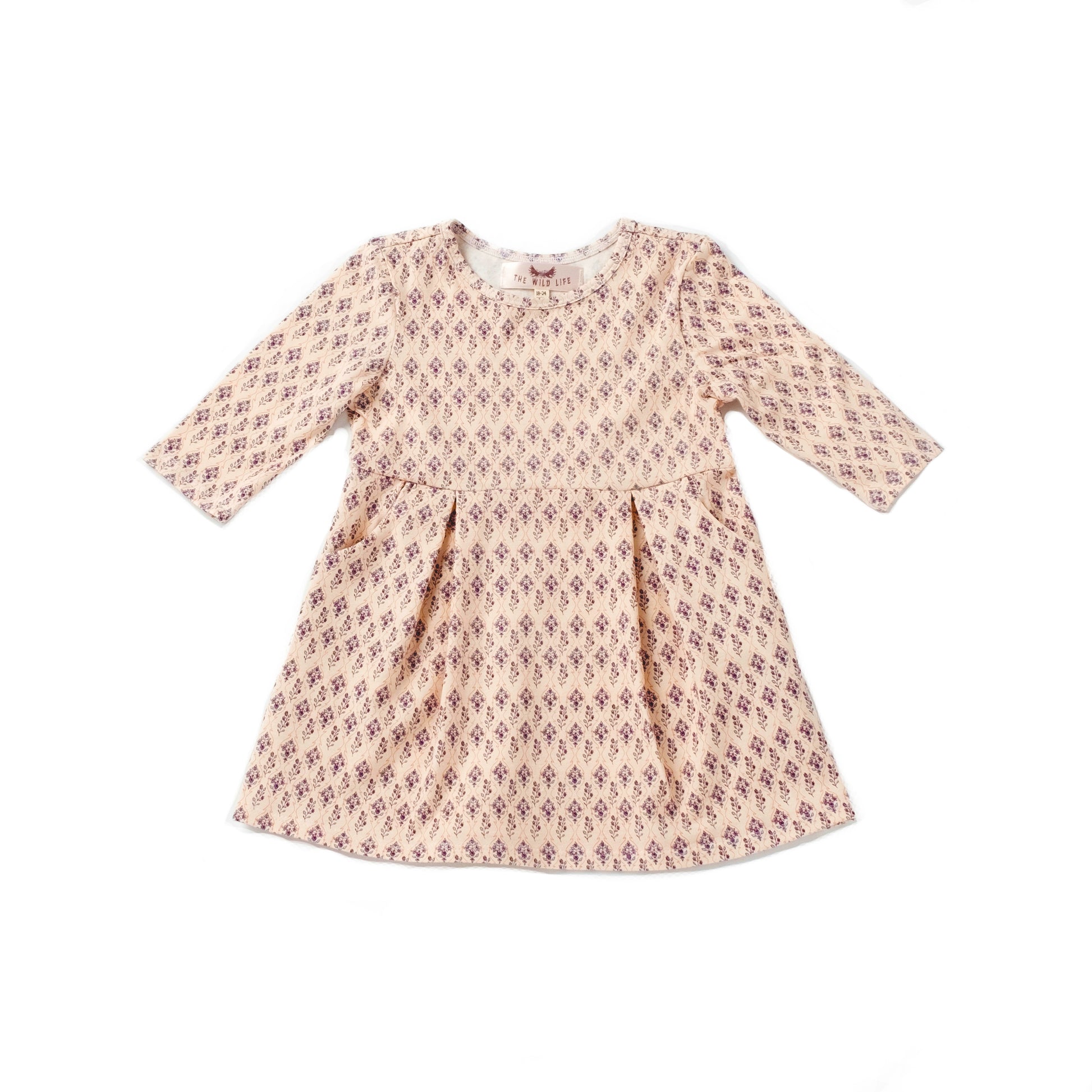 Sweet and classic pocket dress in a timeless purple floral print. Knit fabric, ¾ sleeves, rounded neckline, pull-on style.